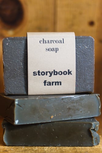 Charcoal soap has a lovely, unisex cologne scent. The charcoal is made right on the Farm--out of cherrywood.